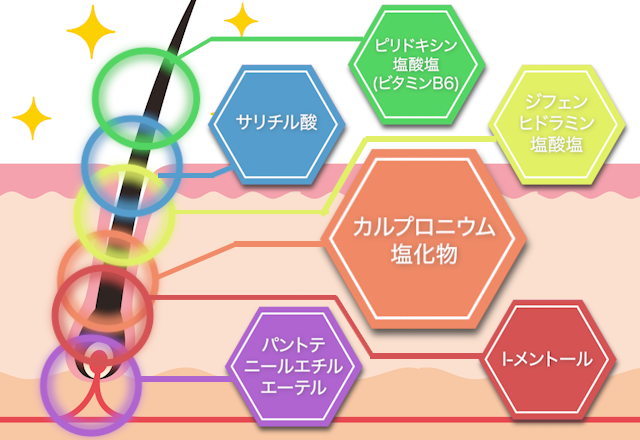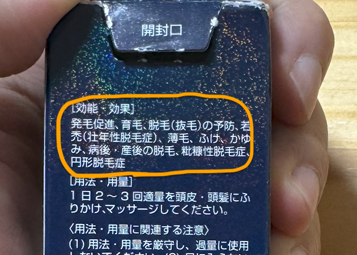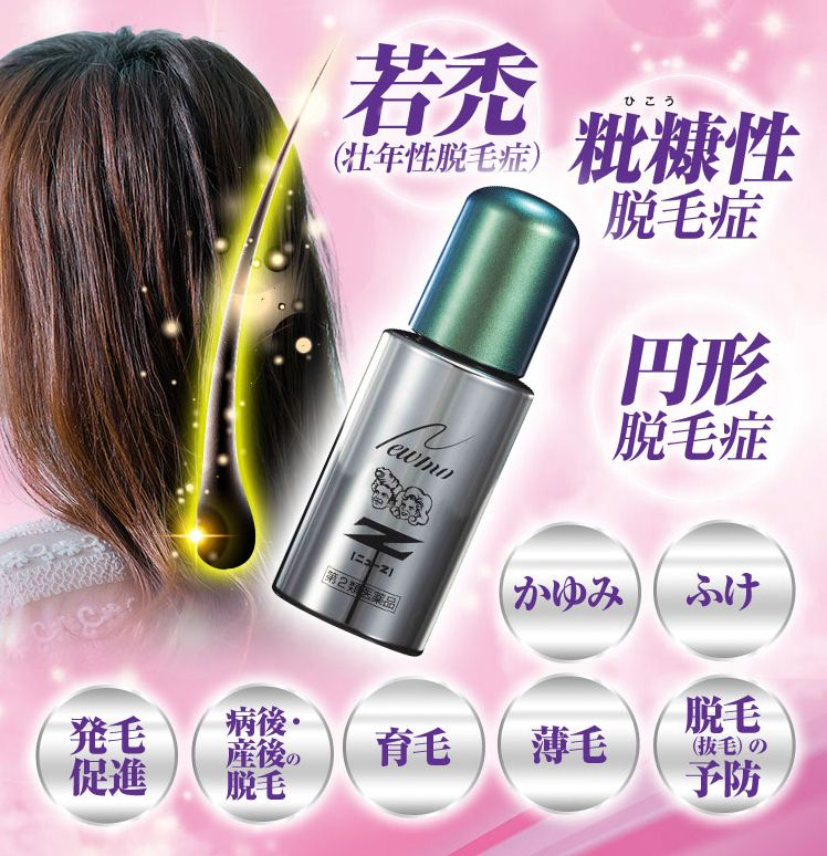 ※効能効果:発毛促進、育毛、脱毛(抜毛)の予防、若禿(壮年性脱毛症)、薄毛、ふけ、かゆみ、病後・産後の脱毛、粃糠性脱毛症、円形脱毛症。